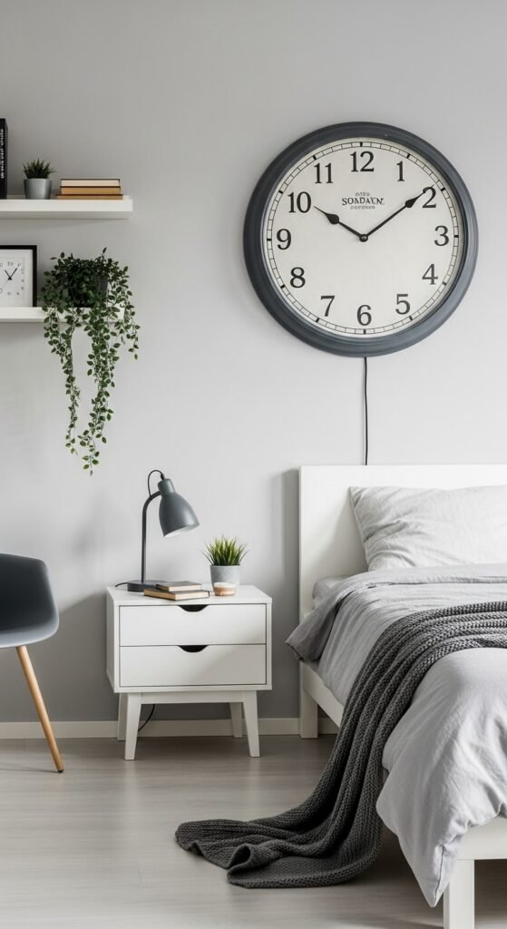 An oversized wall clock is both practical and artistic. It fills empty space and helps you stop checking your phone at night.