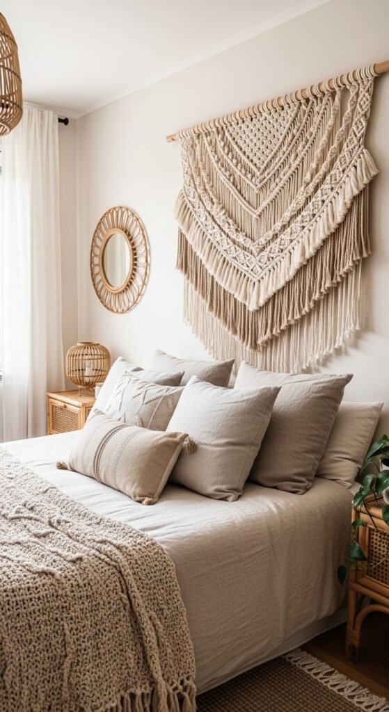 Macrame wall hangings add a soft, handmade feel. They are perfect for covering a small area above a nightstand or a reading nook.