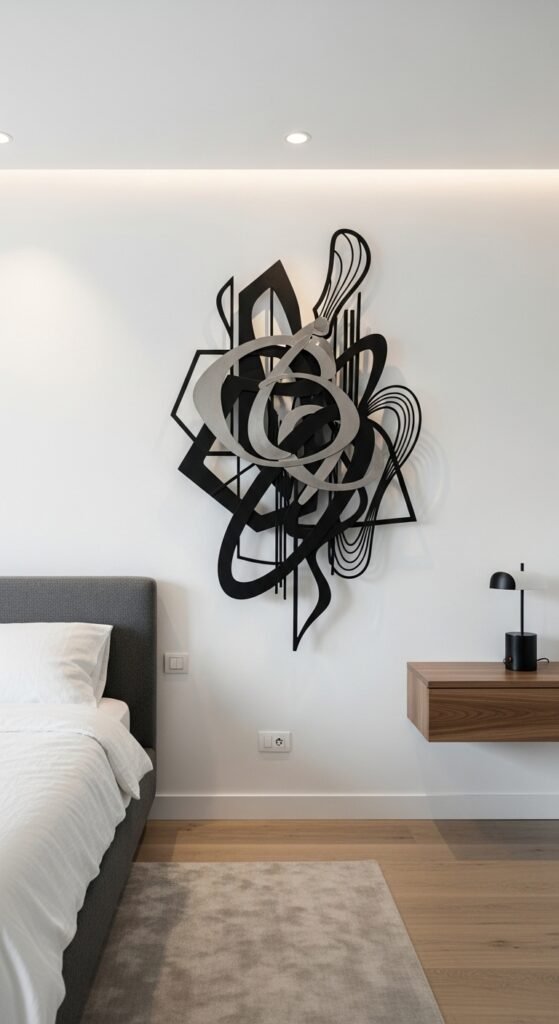 If you want bedroom wall decor that feels like a gallery, choose a metal wall sculpture. These are usually abstract shapes (leaves, circles, or geometric lines) that cast dramatic shadows.