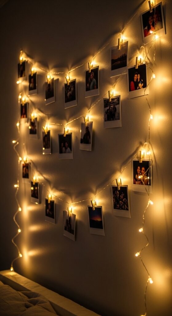 String lights are not just for Christmas. Curtain string lights with tiny wooden clips allow you to hang polaroid photos, postcards, or lightweight fabrics.