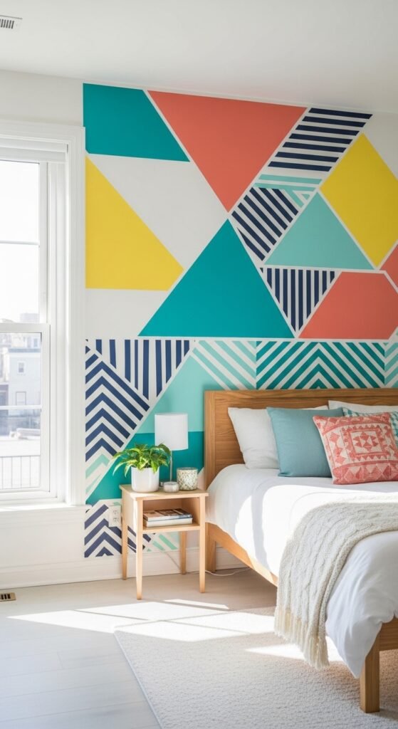 Washi tape is a low-commitment, high-creativity bedroom wall decor. It comes in hundreds of colors and widths, and it removes without residue.