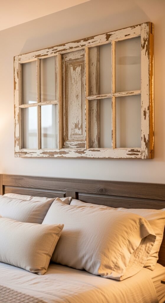 Reclaimed vintage window frames make incredible wall decor. You can leave the glass (adds reflection) or remove it and put photos behind each pane.