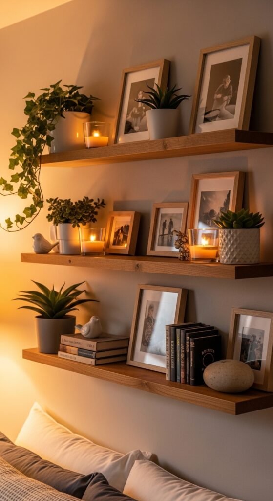 Pro tip: Group items in odd numbers (3 or 5) and vary heights. A set of floating shelves in black or white works in any room.