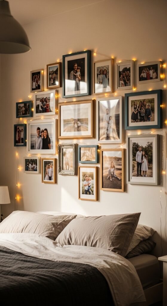 What to buy: Mix black and white photos with one color photo for contrast. Use matching frames (all black, all gold, or all natural wood).