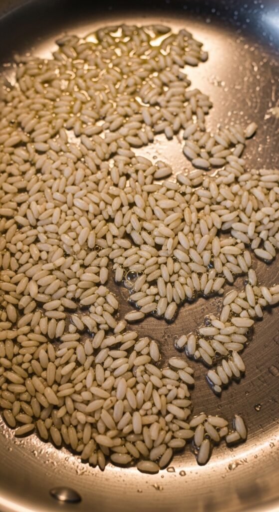 - Add rice, toast until pearly (2 min).