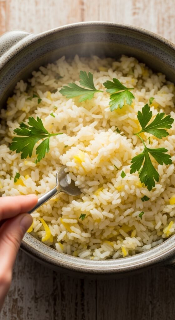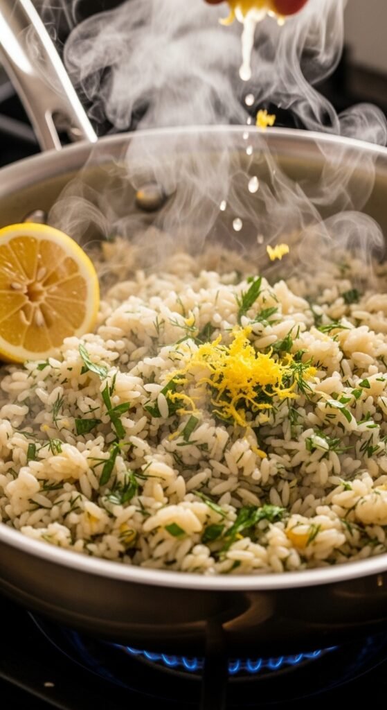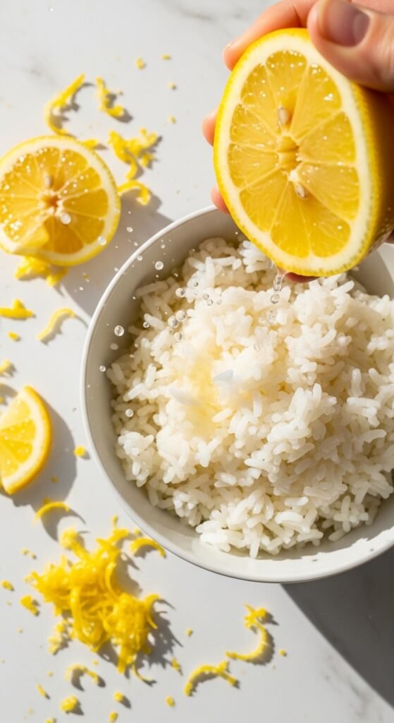 Add the zest of one lemon directly to the hot rice. Stir. The heat will release the essential oils immediately.