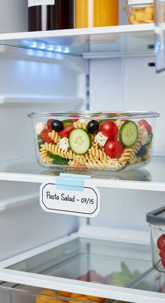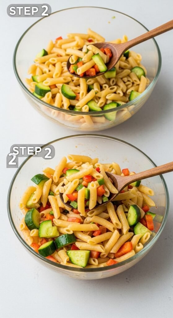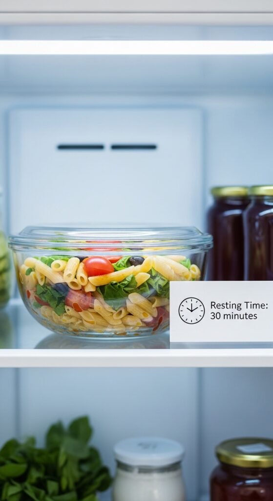 This is the hardest step: wait. Cover the bowl and refrigerate for at least 30 minutes. Overnight is better. During this rest, flavors marry, the pasta absorbs the dressing, and the texture becomes cohesive.
