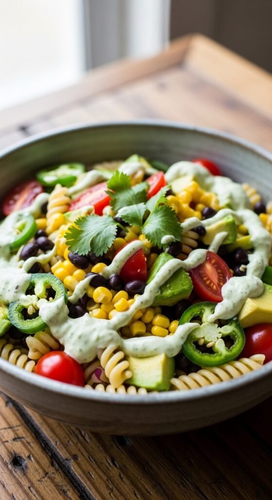 - Texture variety (soft pasta, crunchy veggies, creamy dressing)