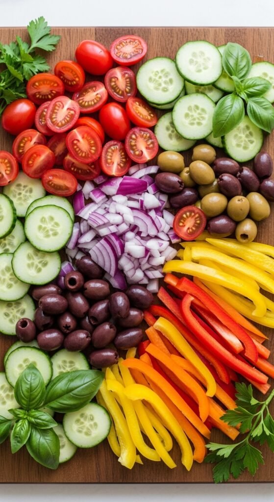 - Veggies: Cucumber, cherry tomatoes, red onion, Kalamata olives