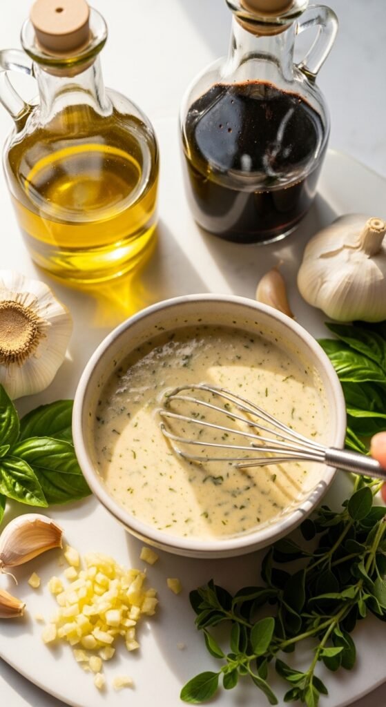 In a mason jar or small bowl, combine all dressing ingredients. Shake or whisk vigorously until emulsified (creamy and unified). Taste and adjust. Too sharp? Add a pinch of sugar. Too bland? More salt or vinegar.