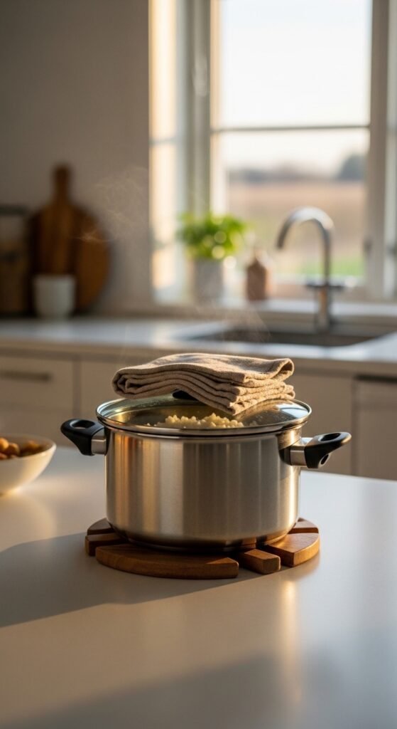When the timer goes off, turn off the heat completely. Do not lift the lid yet. Let the rice rest, covered, for another 5-10 minutes. This allows the steam to finish cooking the grains and lets the moisture redistribute evenly.