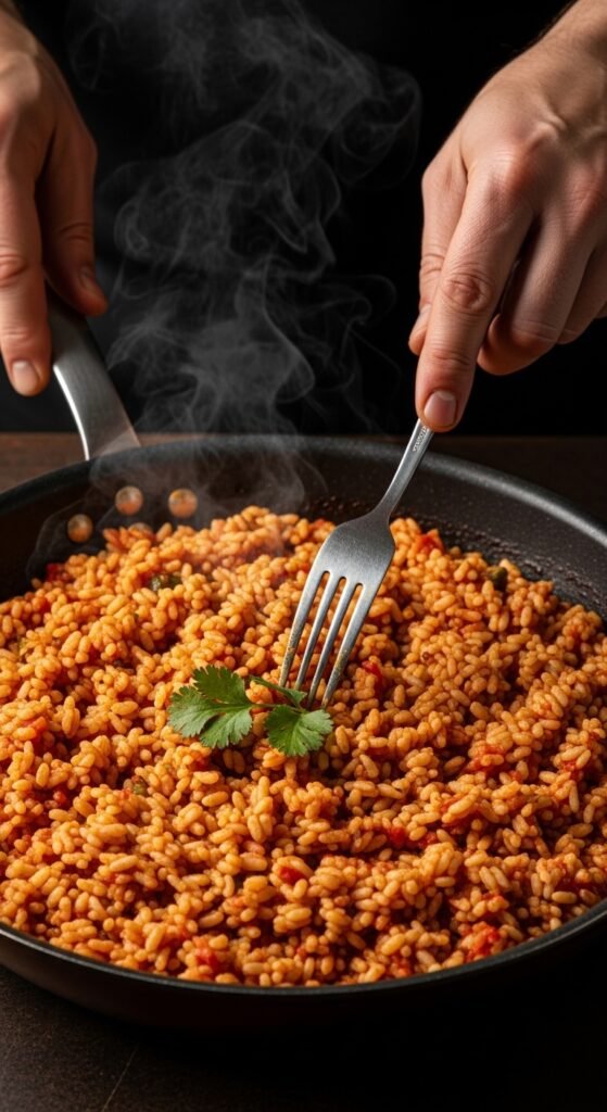 After the resting period, finally lift the lid. Use a fork (not a spoon—a fork separates grains better) to gently fluff the Spanish rice. You should see beautiful, separate grains with a gorgeous orange-red color.