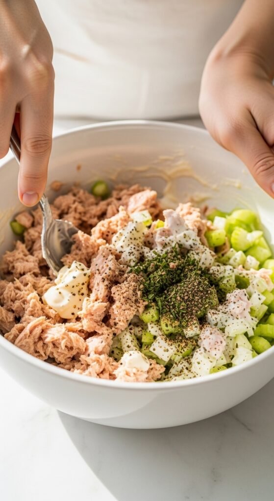 Pour the sauce over the flaked tuna. Add the celery and onion. Use a fork to mix gently. Do not mash it into a paste. You want distinct flakes of tuna. Taste it. Does it need more salt? More acid? Add a tiny splash of pickle juice if it feels flat. Cover and put this bowl in the fridge for 10 minutes. This allows the flavors to marry.