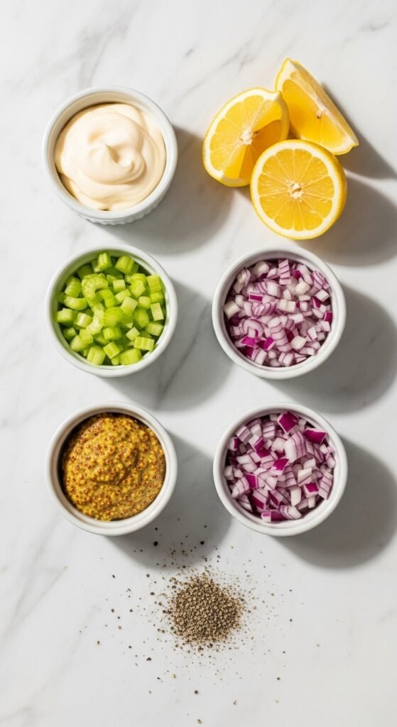 - Celery: Finely diced for a fresh crunch.